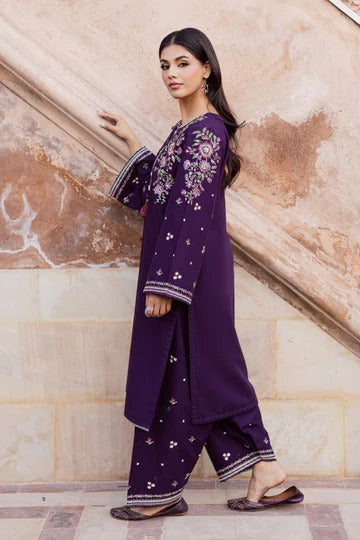 This elegant two-piece set designed in rich purple Lawn features composed embroidery along the neckline and intricate hand stitched detailing at the hem, creating a subtle artisanal finish. The sleeves are adorned with an embroidered spread and bordered cuffs, adding structure and balance to the graceful silhouette.