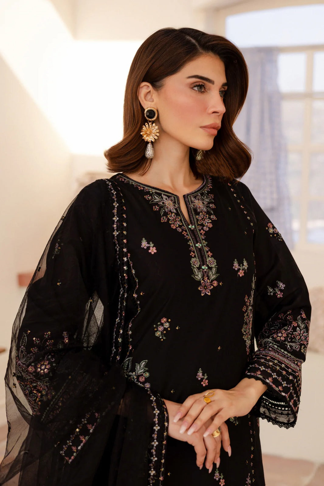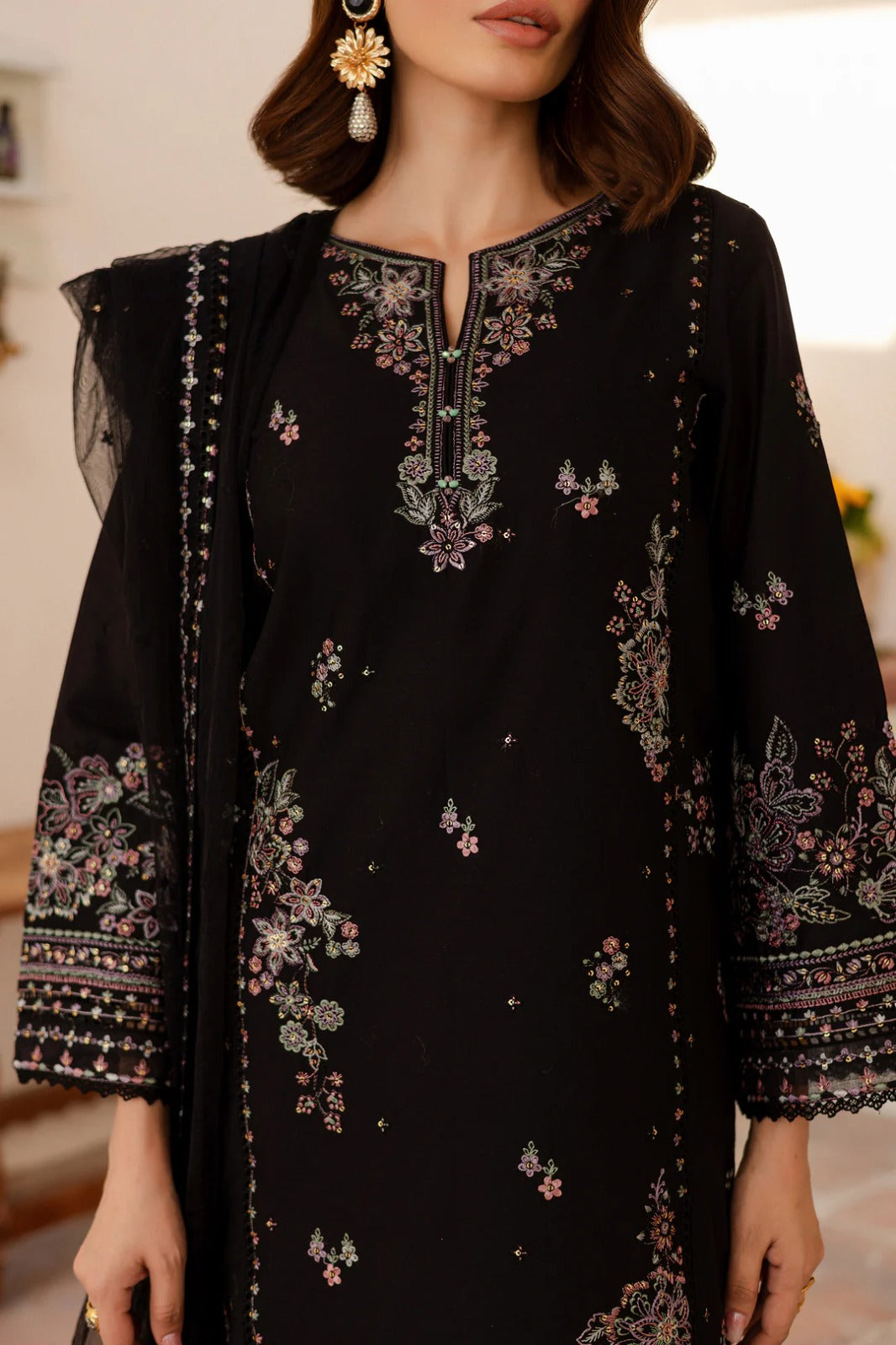 The 3-piece dress in elegant black pima fabric is a perfect blend of traditional and contemporary design. The kurta features a gracefully adorned neckline with delicate threadwork, beautifully extending into scattered floral motifs across the fabric. Full-length sleeves and the hem are enhanced with detailed embroidered borders, adding a refined charm to the overall look.