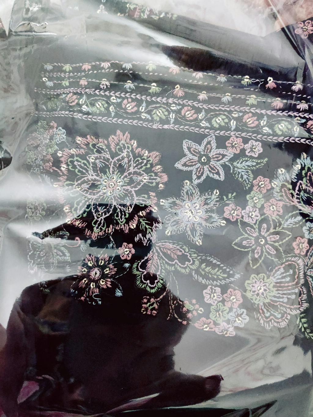 The 3-piece dress in elegant black pima fabric is a perfect blend of traditional and contemporary design. The kurta features a gracefully adorned neckline with delicate threadwork, beautifully extending into scattered floral motifs across the fabric. Full-length sleeves and the hem are enhanced with detailed embroidered borders, adding a refined charm to the overall look.