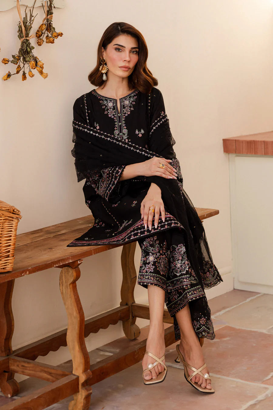 The 3-piece dress in elegant black pure khaddar fabric is a perfect blend of traditional and contemporary design. The kurta features a gracefully adorned neckline with delicate threadwork, beautifully extending into scattered floral motifs across the fabric. Full-length sleeves and the hem are enhanced with detailed embroidered borders, adding a refined charm to the overall look.
