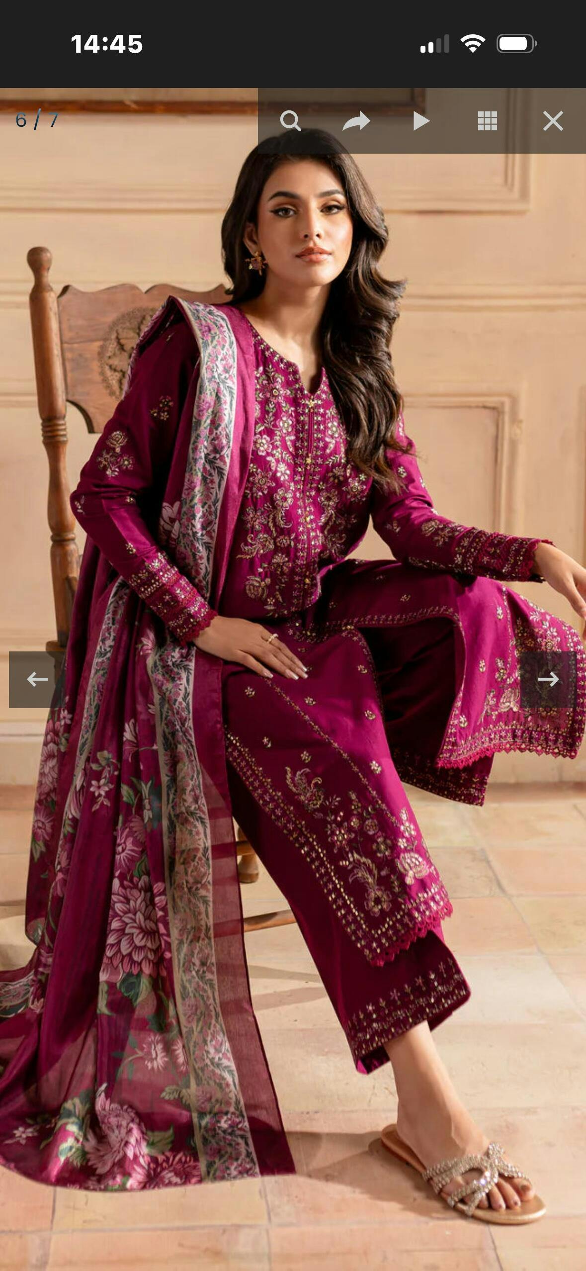 The 3-piece dress in elegant black pure khaddar fabric is a perfect blend of traditional and contemporary design. The kurta features a gracefully adorned neckline with delicate threadwork, beautifully extending into scattered floral motifs across the fabric. Full-length sleeves and the hem are enhanced with detailed embroidered borders, adding a refined charm to the overall look.