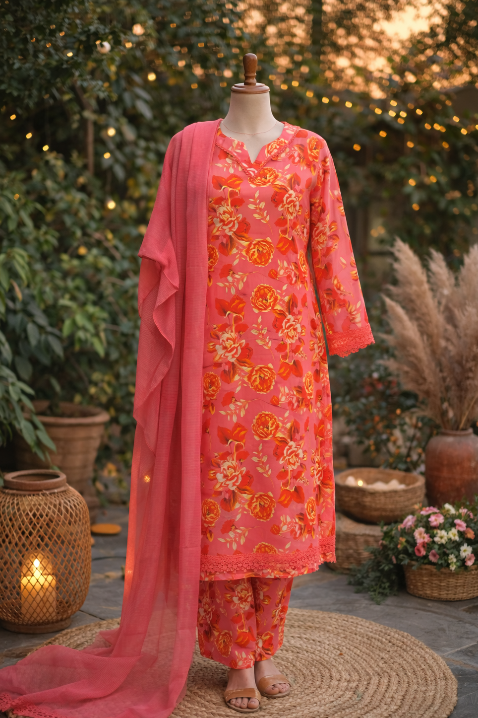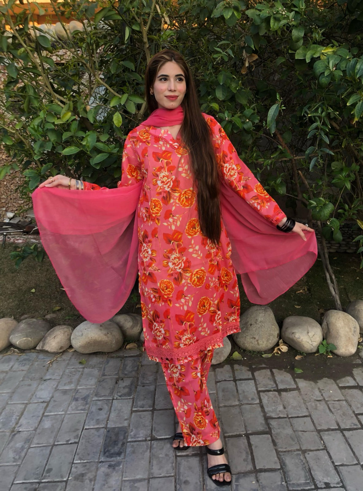 Step into effortless elegance with this ReadyToWear Lawn 3-Piece suit, designed for women who love comfort with style. The soft lawn shirt features an eye-catching all-over floral print that blends vibrant hues with a graceful pattern, creating a fresh and feminine look. Paired with a matching printed lawn trouser, this ensemble offers a perfectly balanced appearance for both everyday wear and semi-formal gatherings. Completing the outfit is a plain chiffon dupatta that adds a light and airy touch, enhancing the overall sophistication while keeping the look simple and refined. Crafted from breathable premium lawn, this suit is ideal for summer and remains timeless in style, making it a must-have addition to your wardrobe.