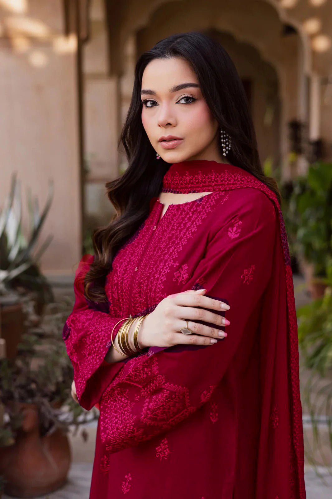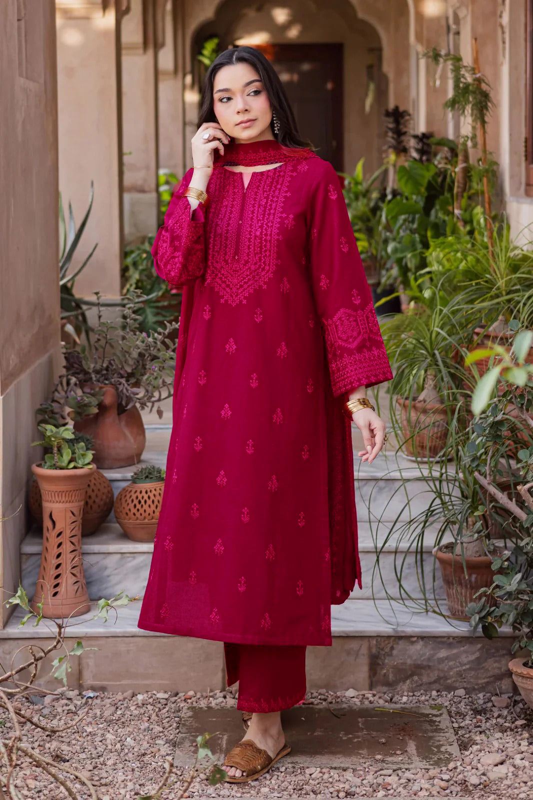 Crafted with finesse, this magenta pink  Lawn shirt features a heavily embroidered neckline adorned with contrasting beads for a striking finish. The composed embroidery spreads across the front, while the heavily embroidered sleeves add richness and depth. It’s a show-stopping piece designed for festive gatherings and formal evenings.
