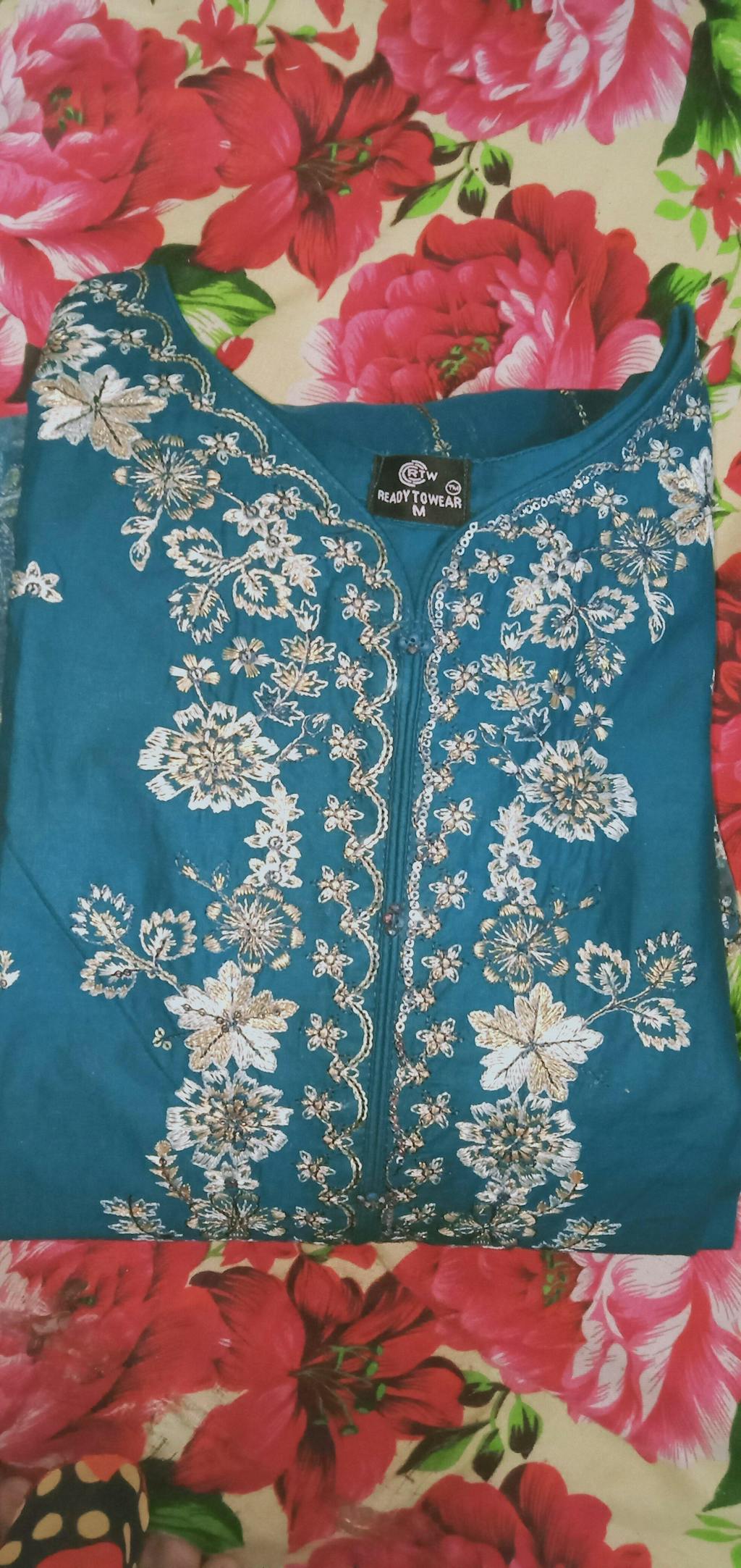 This macaroon blue panelled knee-length front-open Winter Cotton shirt features intricate embroidery across the front, with a flattering V-neckline. It’s beautifully finished with self-piping, lace, and a crystal collage for added sparkle. The hem is elegantly completed with samosa lace, adding a refined touch.The embroidered sleeves, with a spread of delicate detailing enhances the overall design.