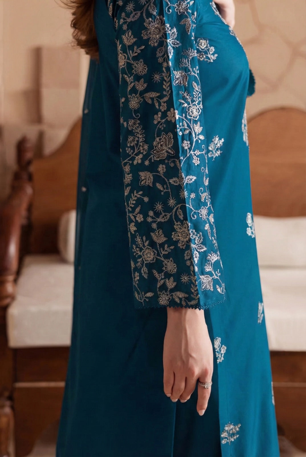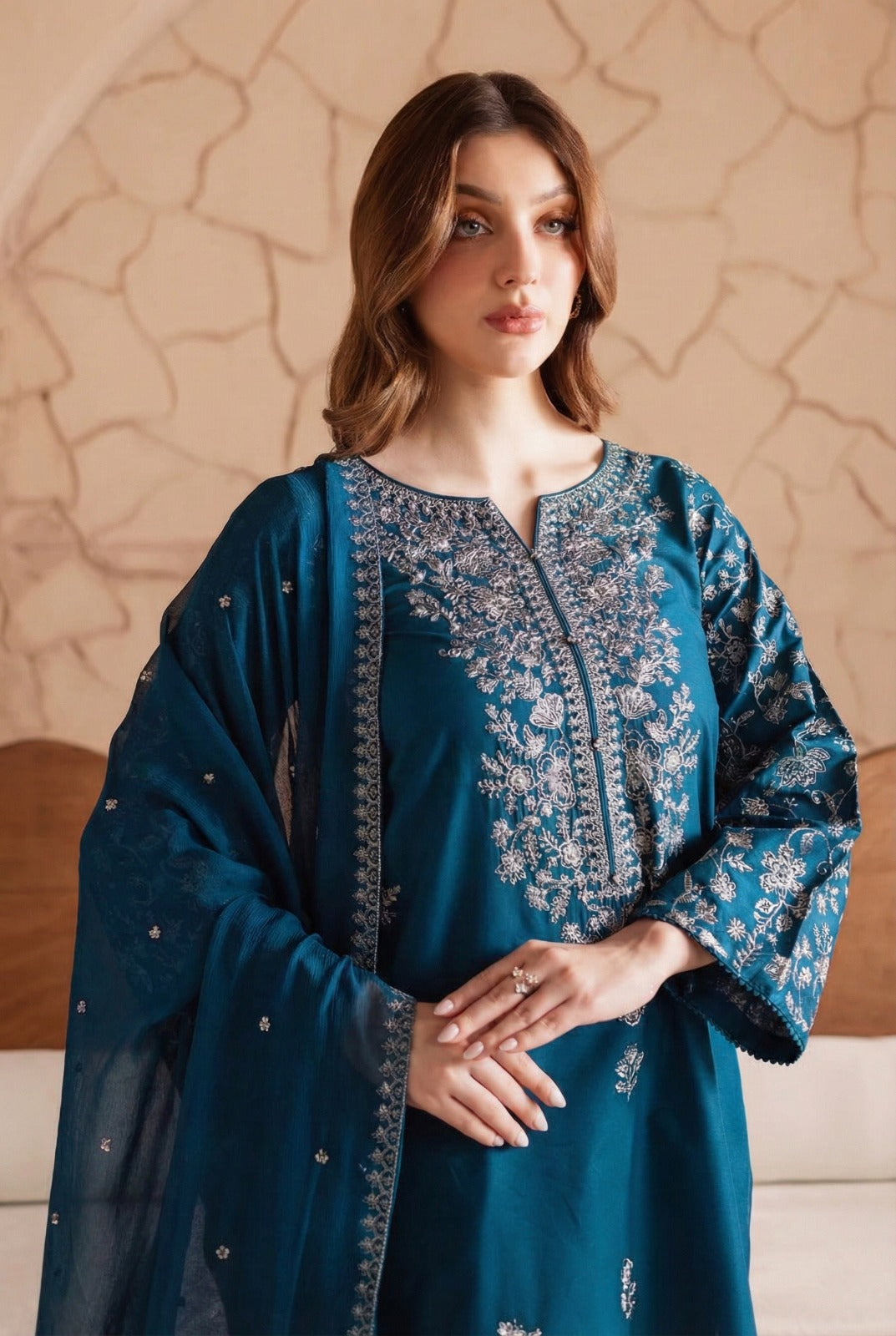This 3-piece ensemble features a zinc colored beautifully composed pure khaddar shirt with a heavily embroidered neckline and an intricate embroidered jaal spread across the sleeves, creating a luxurious and eye-catching look. Designed for elegance and ease, this outfit is ideal for festive gatherings and special occasions.