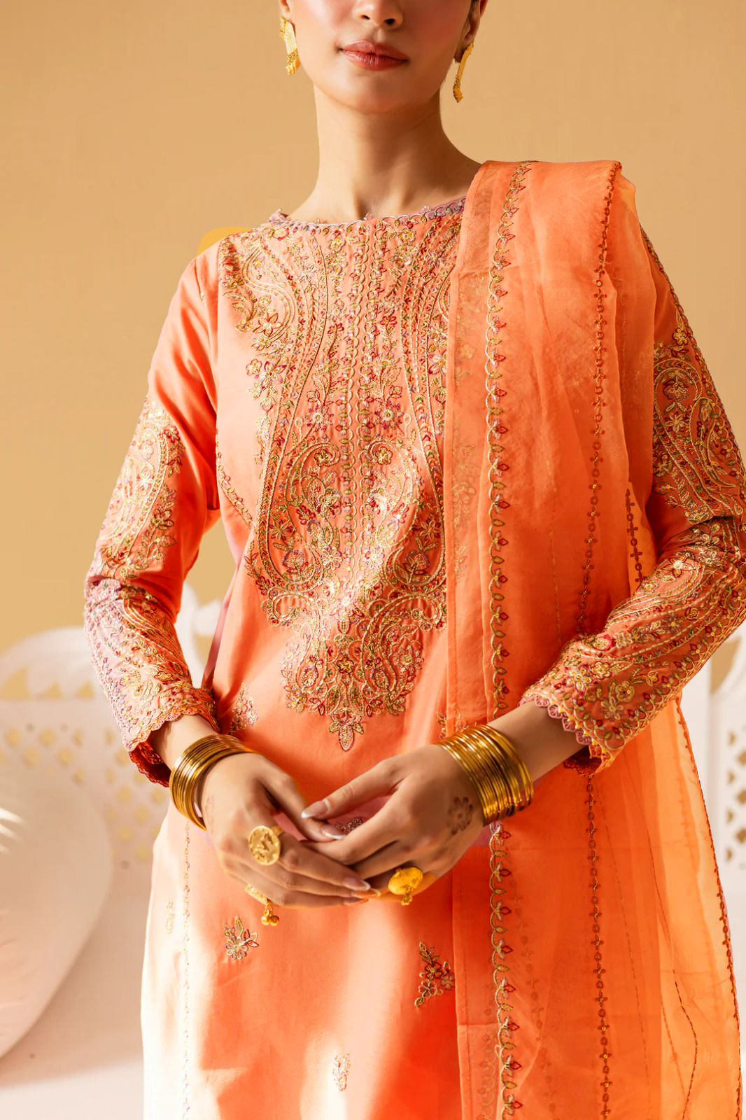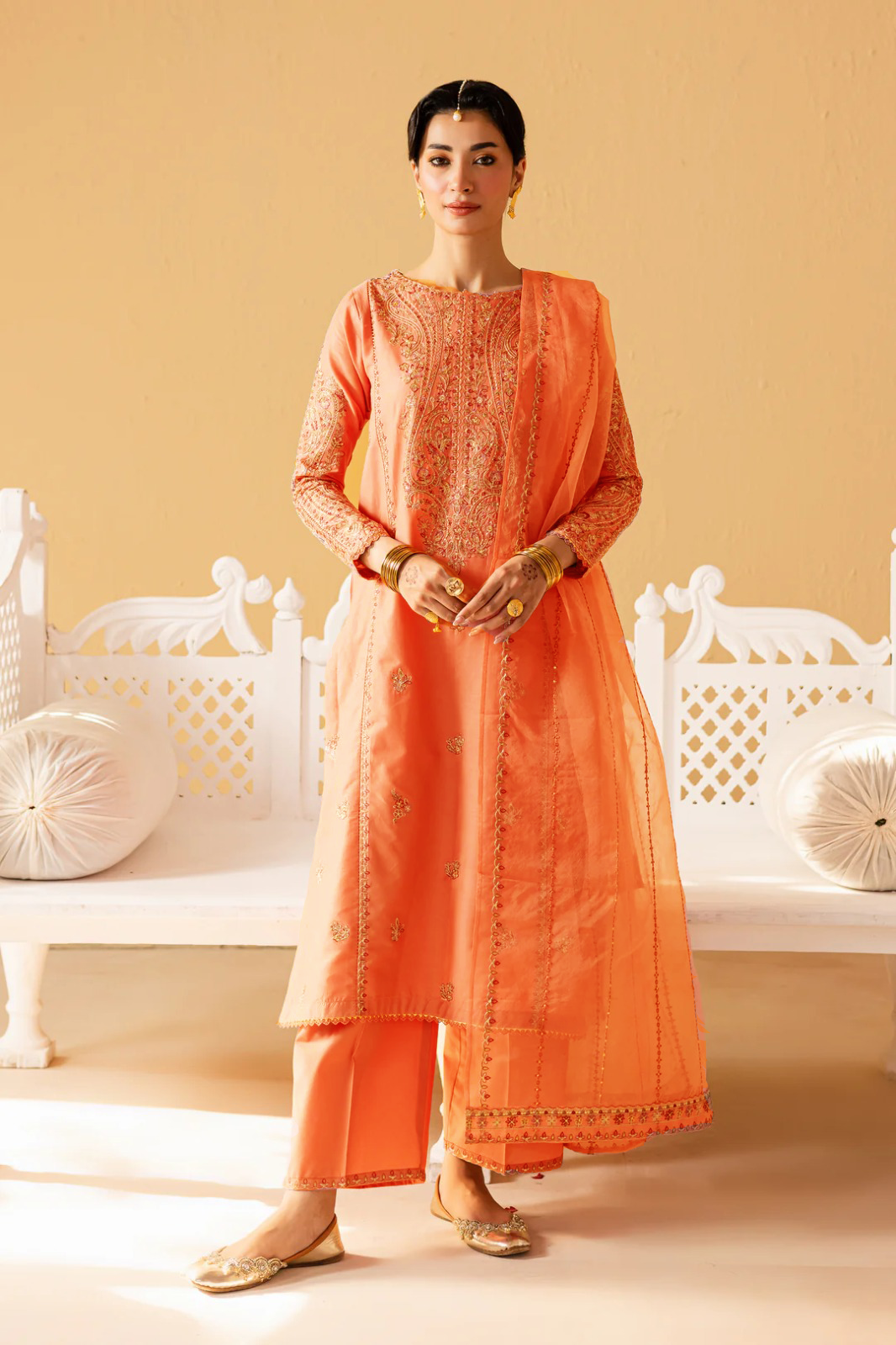 The organza embroidered dupatta completes the ensemble with its light, airy feel and delicate embroidery, adding a graceful finish that ties the entire look together beautifully.