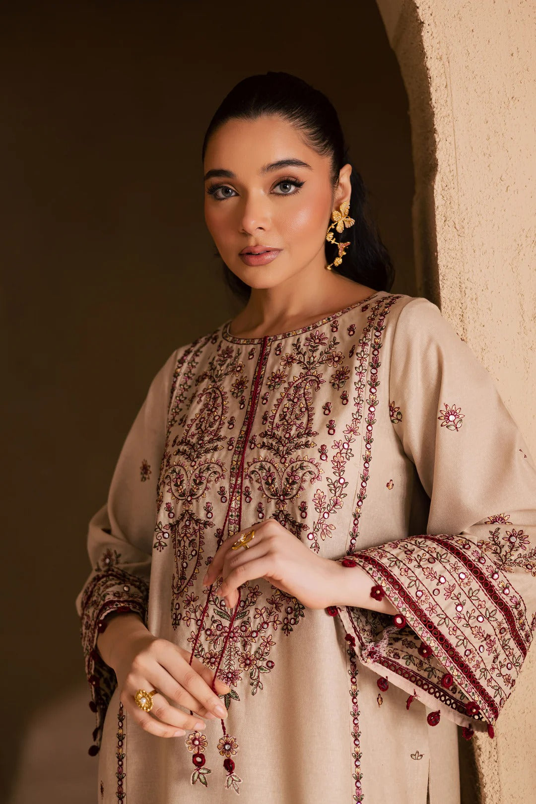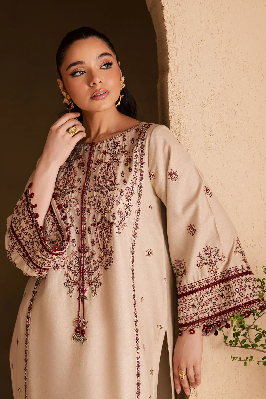 Paired with a Lawn shalwar adorned with an embroidered border at the hem, the look strikes the perfect balance between tradition and modern sophistication. Thoughtfully designed and beautifully detailed, Safa is an elegant expression of everyday luxury and festive poise.